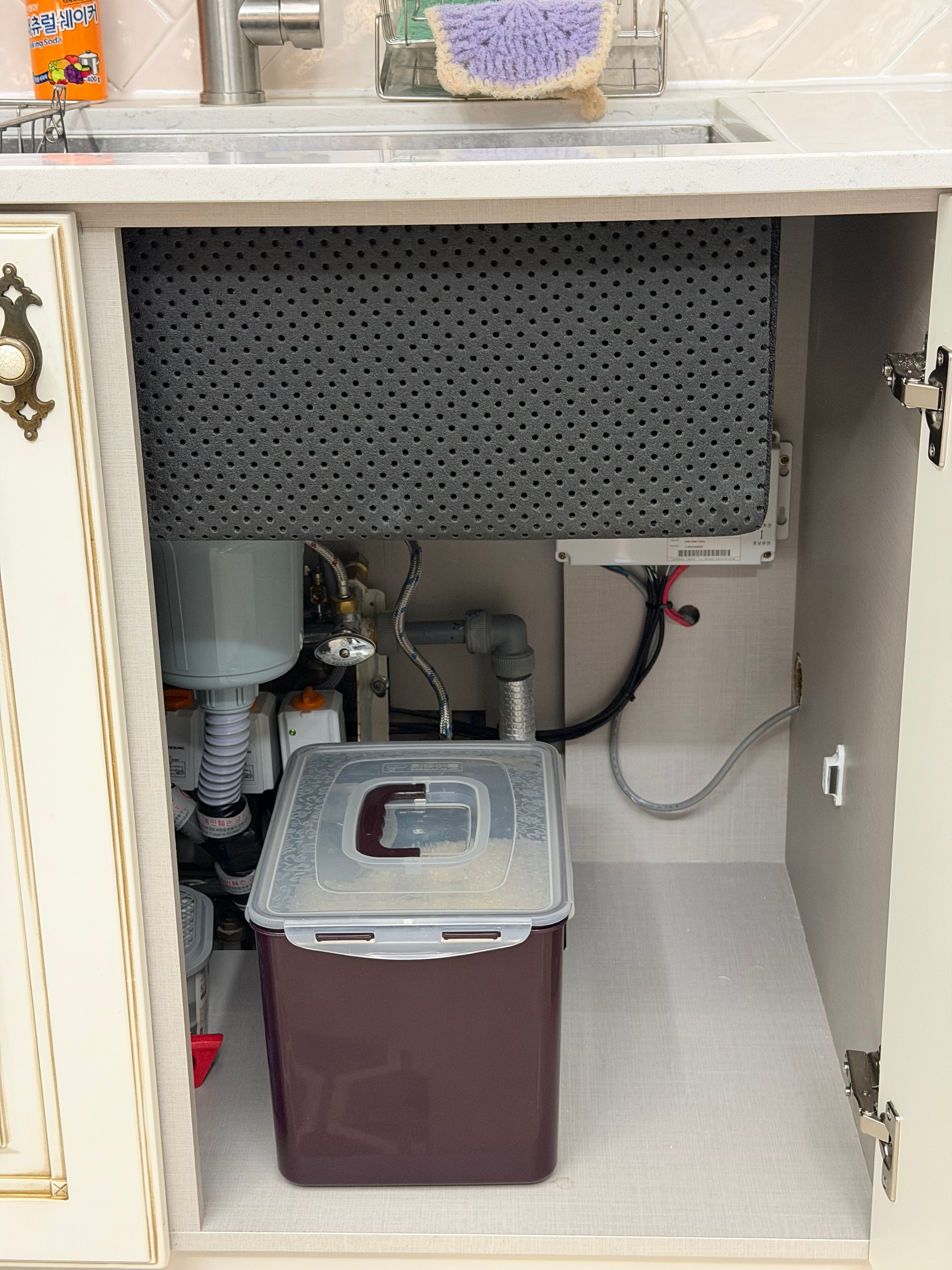 싱크대 하부장에 LG 정수기 본체가 있던 자리에
