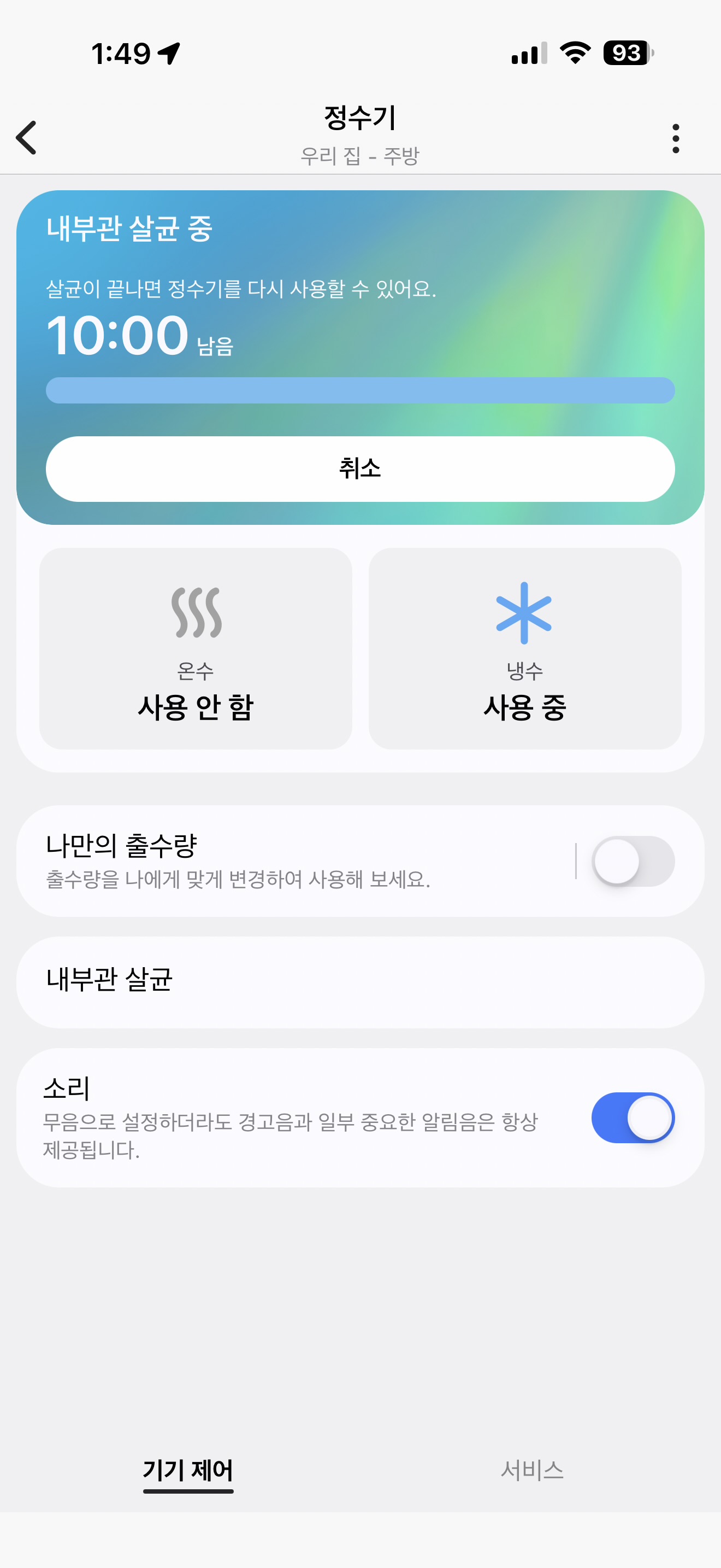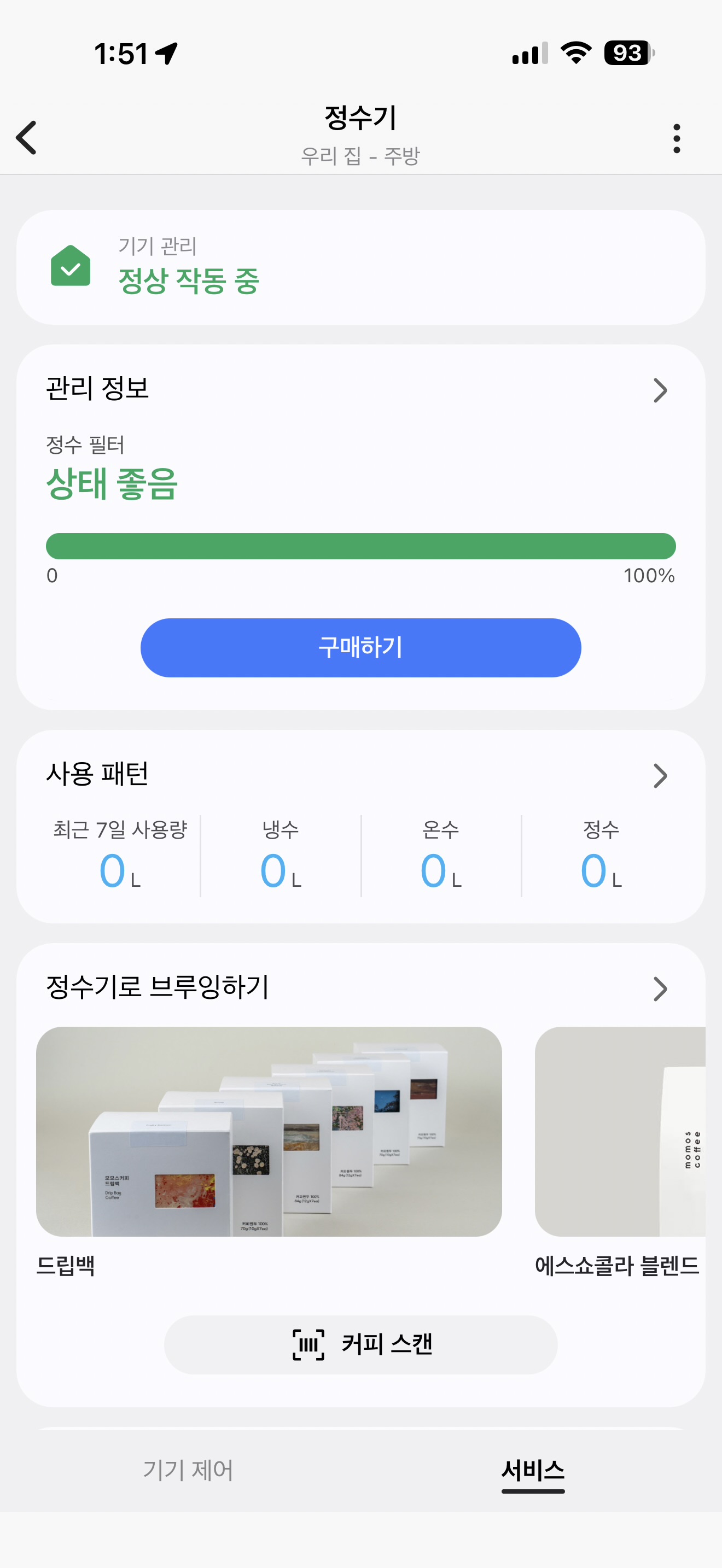 앱에서 기능을 풀어줘야 사용 가능한 90도 고온수에 경우는